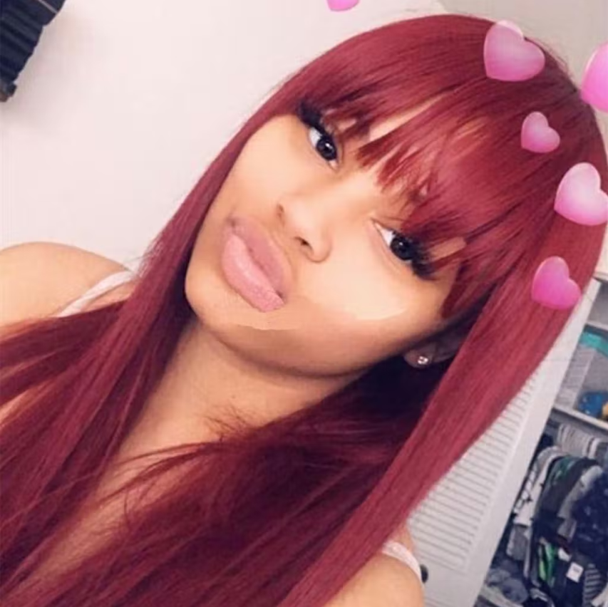 Burgundy 99J Silk Straight Human Hair Wig with Bangs Glueless Top 2x4 Lace Wig Fringe Style